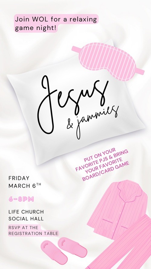 Ladies, you're invited to game night with Women of Life! Wear your PJs and bring your favorite card or board game and join us in the Social Hall for a night of fun and fellowship!